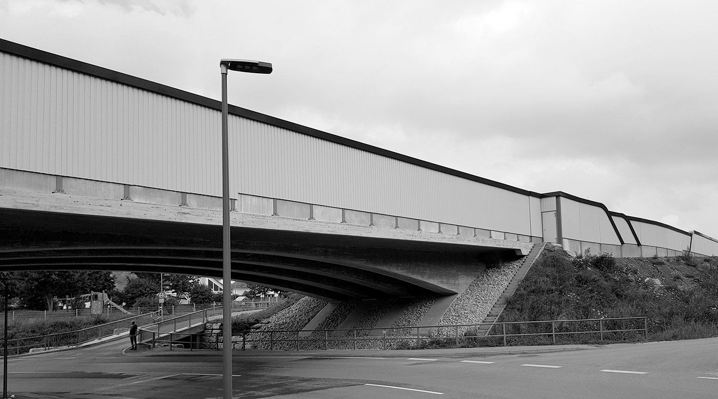 In the course of the multi-lane expansion of the B10 near Gingen, the BW 16 transfers the B10 over the district road using a single-span, longitudinally prestressed frame structure with a clear width of 38.0 m. The cross-section is a four-bar T-beam