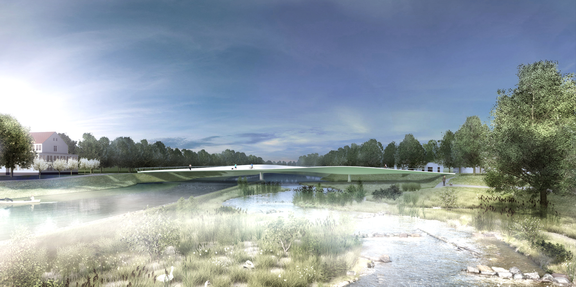 gewährleistet. Durch die wechselseitig angeordneten Finnen wird der Erlebniswert der Brücke maßgeblich gesteigert und eine gelungener Wechsel zwischen halbgeschütztem Raum und Erleben der Landschaft geschaffen."
