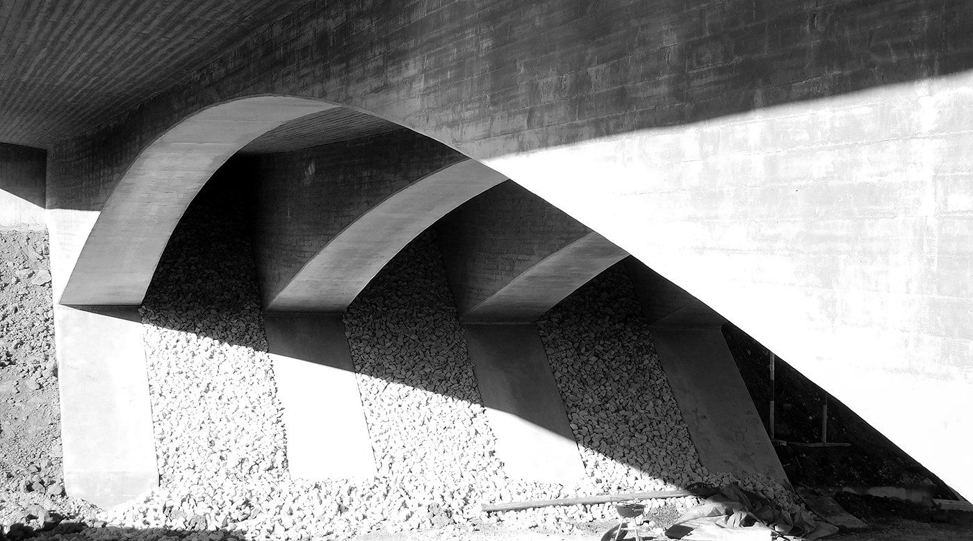 designed and has a variable height between 3.10 m at the frame corner and 0.75 m in the center of the bay. The width between the railings is 16.60 m. The structure is founded on large bored piles with a diameter of 1.20 m. There is a drag plate at the end of the structure.